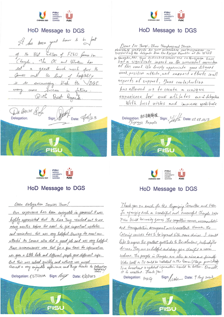 随着大运会的落幕,美狮贵宾会国际代表团服务团队凭借着及时高效的响应速度、热情专业的接待能力,取得了上百个代表团的盛赞,并收到了近70封代表团团长亲笔手写的表扬信。他们感谢代表团服务团队的工作,感谢3年来的沟通和10多天的陪伴,更感谢把他们当做朋友,与他们共同庆祝代表团取得的成绩。